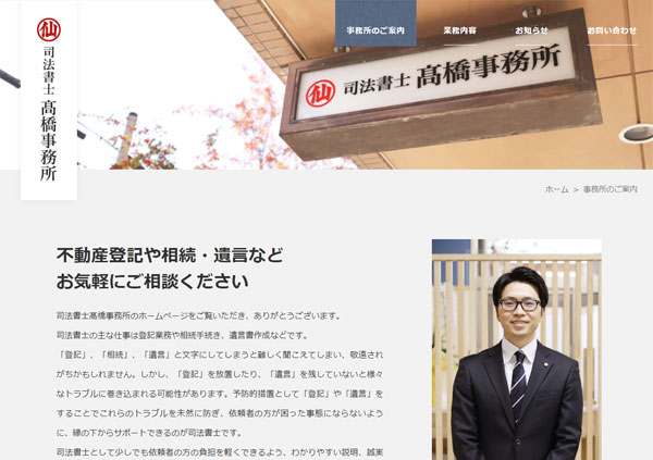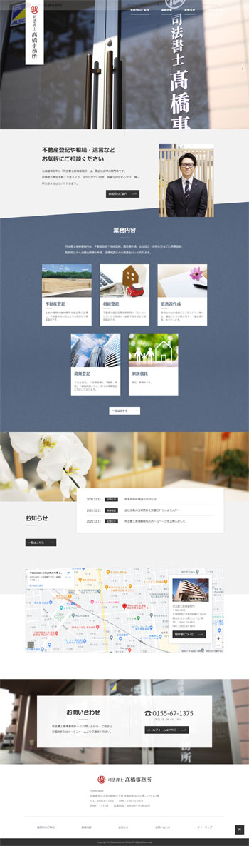 北海道帯広市で不動産登記や相続登記、遺言書作成、会社設立、役員変更、法律相談などの業務を行う「司法書士高橋事務所」のホームページを制作いたしました。